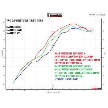 For starters, they designed the 790/890 intake to act as one large velocity stack smoothly leading the intake charge right into your two OEM stacks. The result is a massive increase in unlocked horsepower and smooth delivery Rottweiler Performance has been known for. What are the gains? Hold on to your Powerparts seat, dyno testing on our bone stock 790 Adventure test bike simply installing the system with no additional mapping the gains over stock to the rear tire were over 10 horsepower at 6300 RPM, right where you ride the bike! (See additional pics for dyno charts)