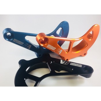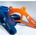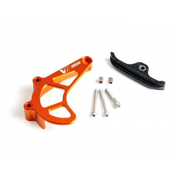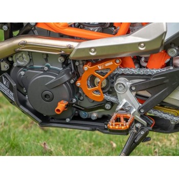 CNC machined from a solid piece of billet aircraft grade aluminum this case saver was built to protect your fragile engine case and clutch slave cylinder. In addition to the protection it also provides a window to view your front sprocket condition and access to clean/remove debris unlike the stock cover. Each case saver comes with proper OEM KTM hardware.