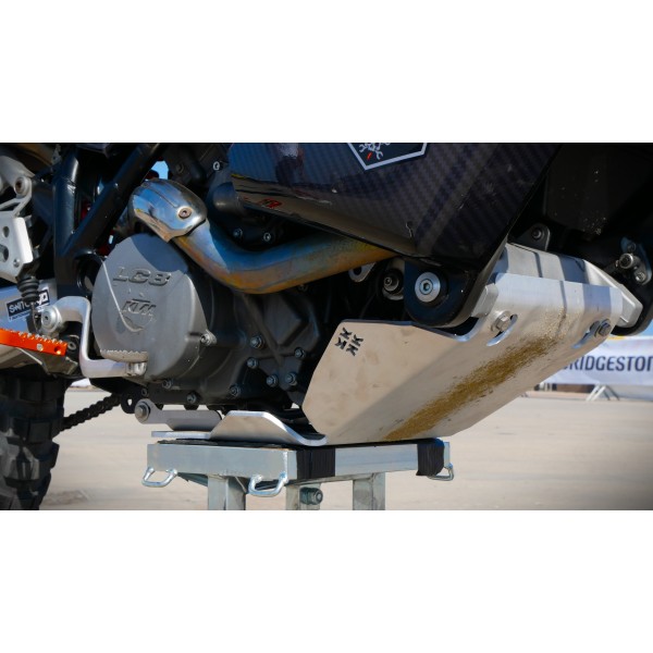 Engine guard in 6 mm thick aluminium plate, stainless steel fixing brackets STANDARD VERSION - The battery can remain in its original position XTREME VERSION - The battery must be moved under the saddle Extremely resistant but light, it can be mounted exactly like the original using the screws supplied. Recommended for medium off-road situations and excellent on sand. It has holes and slots that allow you to fix the tire lever kit supplied as an option, so you have it at hand in case of need. There are also additional holes and slots to be able to attach other tools.